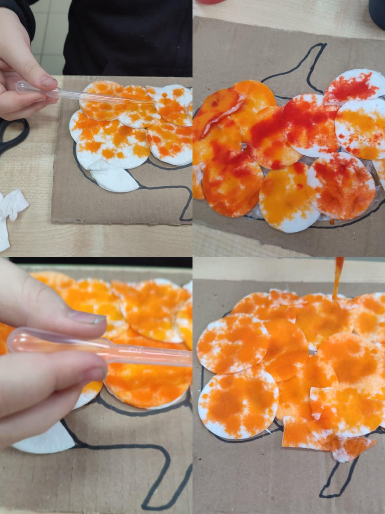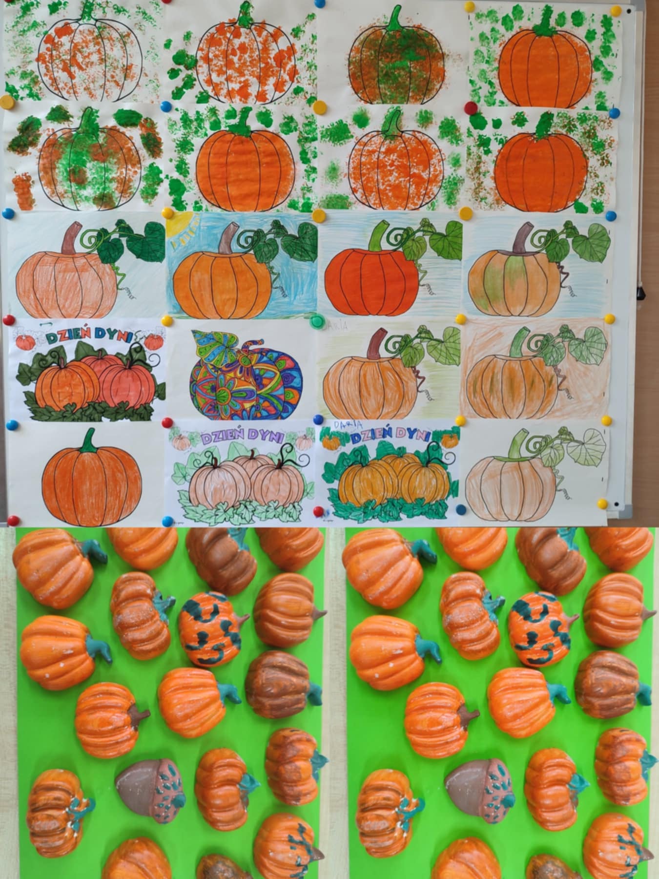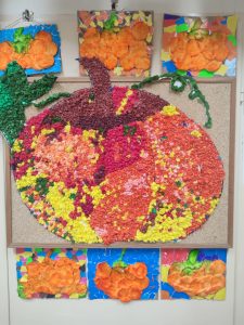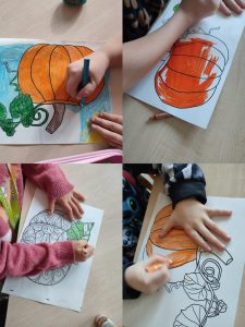 Do prac użyliśmy: farb, folii bąbelkowej, gipsówek w kształcie dyni, płatków kosmetycznych, pipet, barwników spożywczych a także kolorowych papierów. Oczywiście nie zabrakło kredek i mazaków do kolorowania obrazów dyni i mandali.