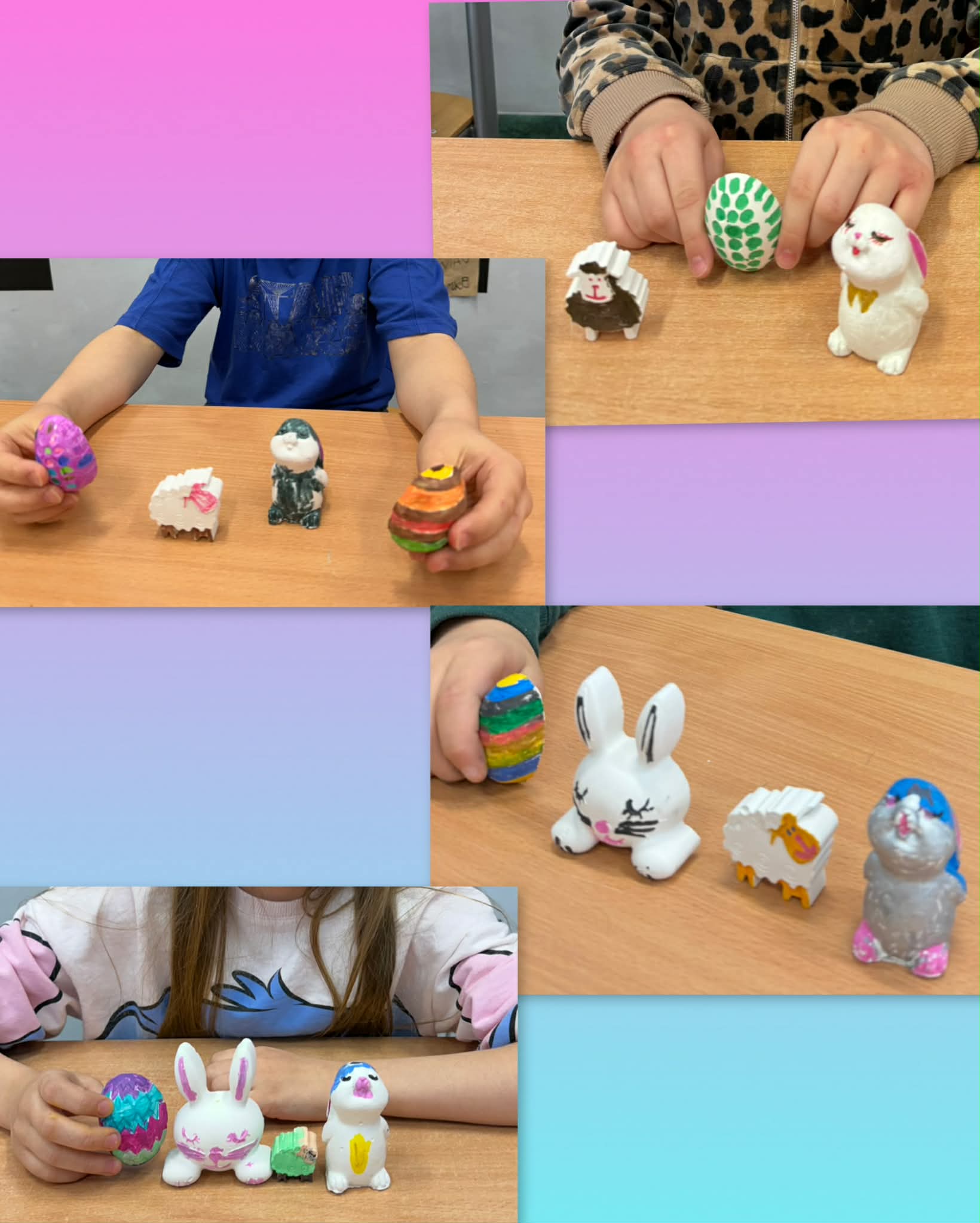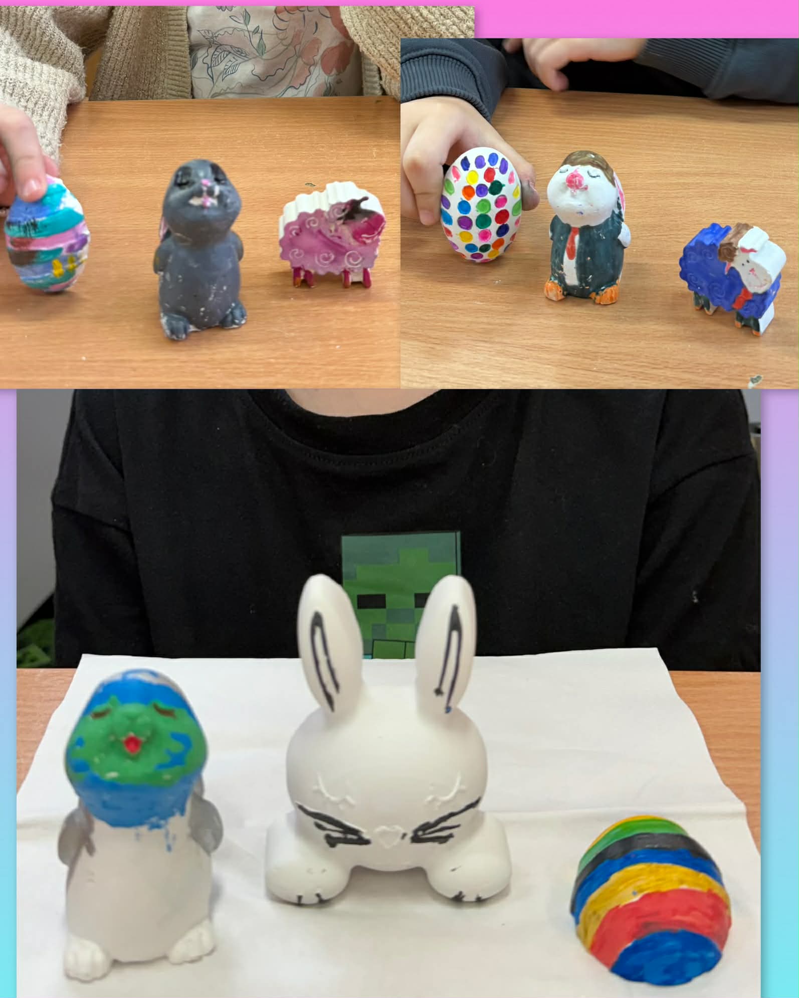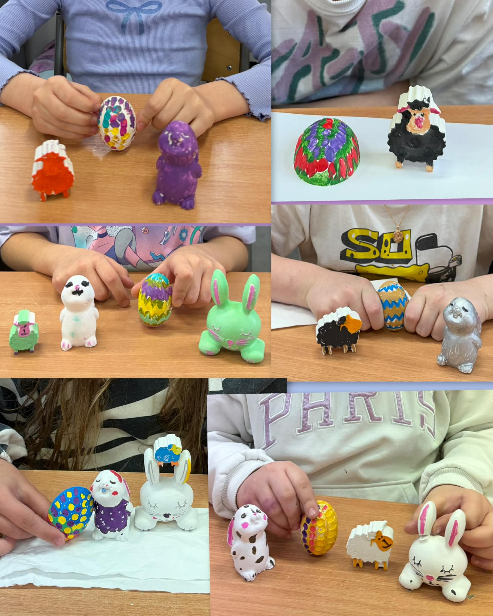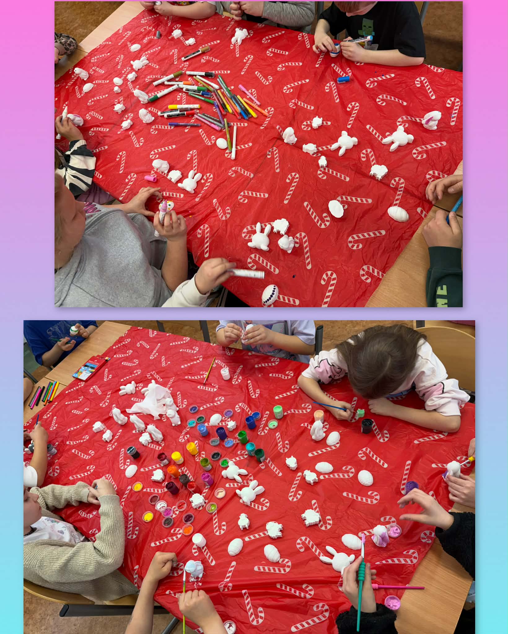 Dużym zainteresowaniem cieszyły się warsztaty plastyczne, podczas których uczniowie malowali gipsowe figurki: zajączków, jajeczka oraz baranki. Drugoklasiści z ogromnym zaangażowaniem dobierali kolory i zdobienia, tworząc niepowtarzalne prace. Warsztaty rozwijały zdolności manualne, wyobraźnię oraz cierpliwość.