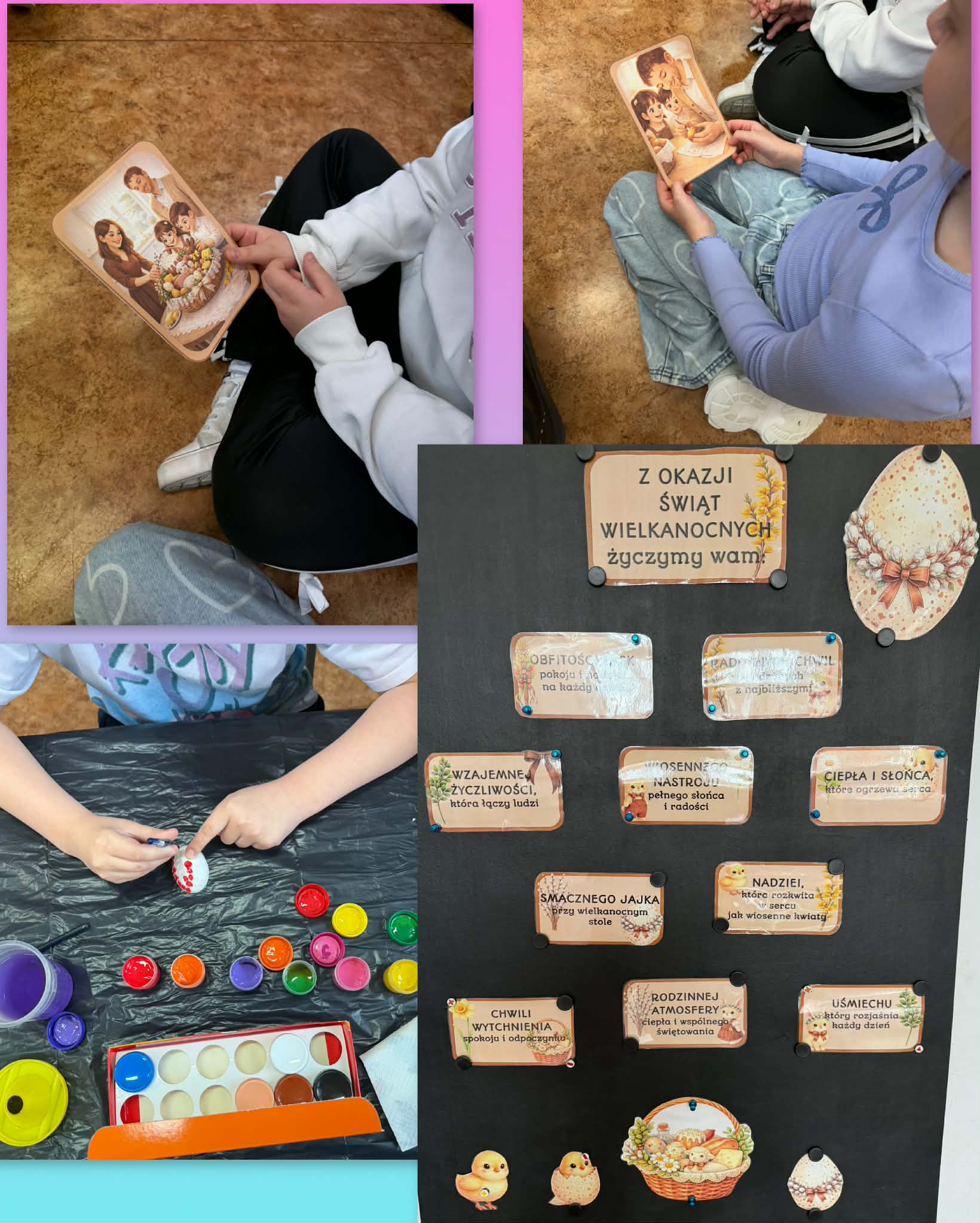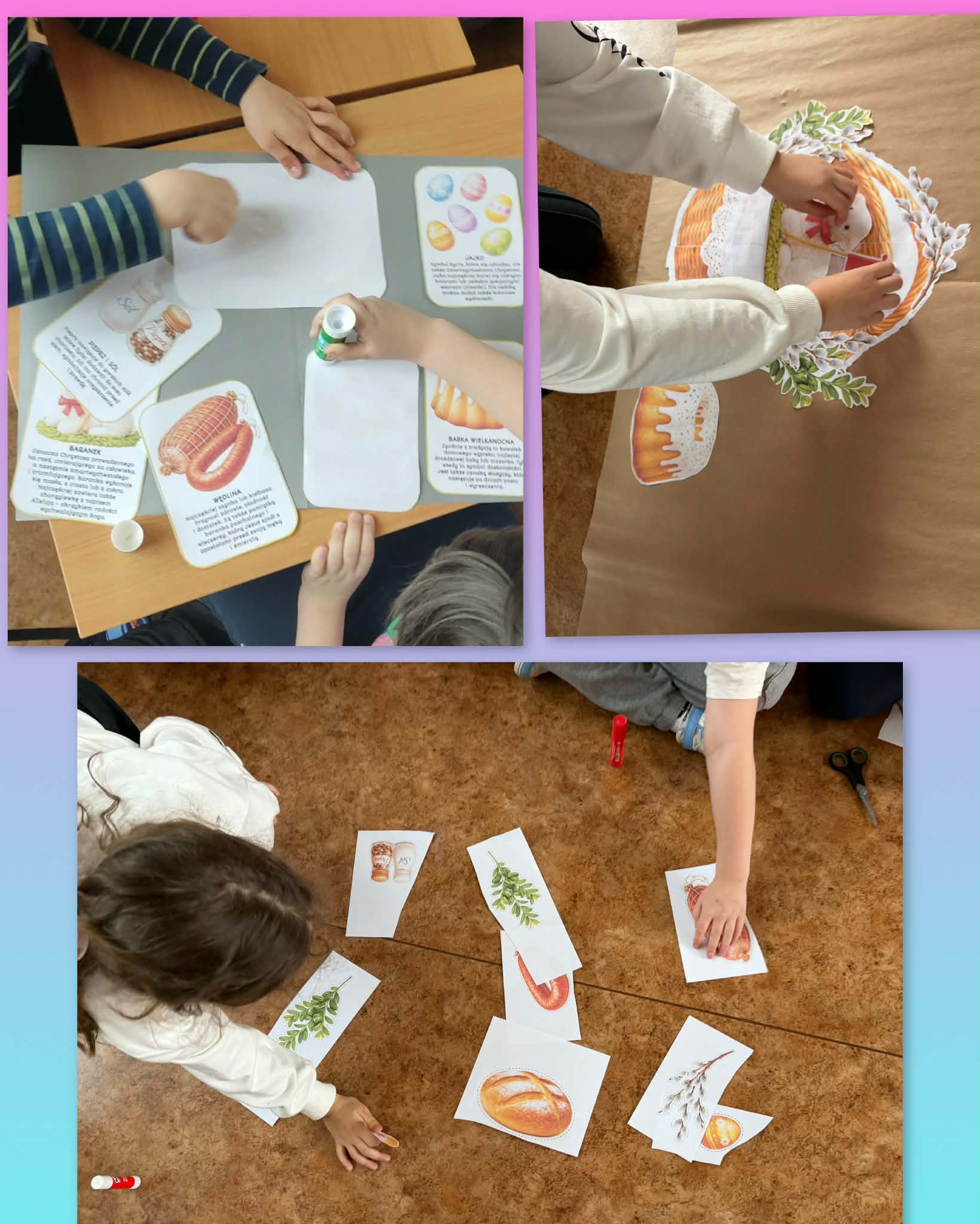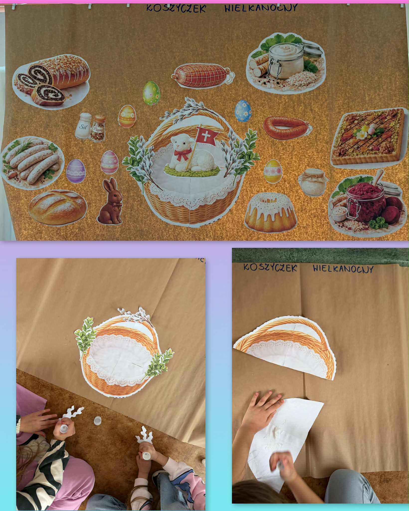 Zajęcia rozpoczęły się od wysłuchania bajki pt. ,,Koszyczek Rozalii i Wiktora” oraz pogawędką na temat Wielkanocy. Uczniowie chętnie wypowiadali się na temat symboli świątecznych oraz zwyczajów kultywowanych w ich domach, takich jak przygotowywanie koszyczka wielkanocnego, malowanie pisanek, święcenie pokarmów, uroczyste śniadanie czy śmigus-dyngus. Rozmowa sprzyjała rozwijaniu umiejętności wypowiadania się i utrwalaniu wiedzy o tradycjach.