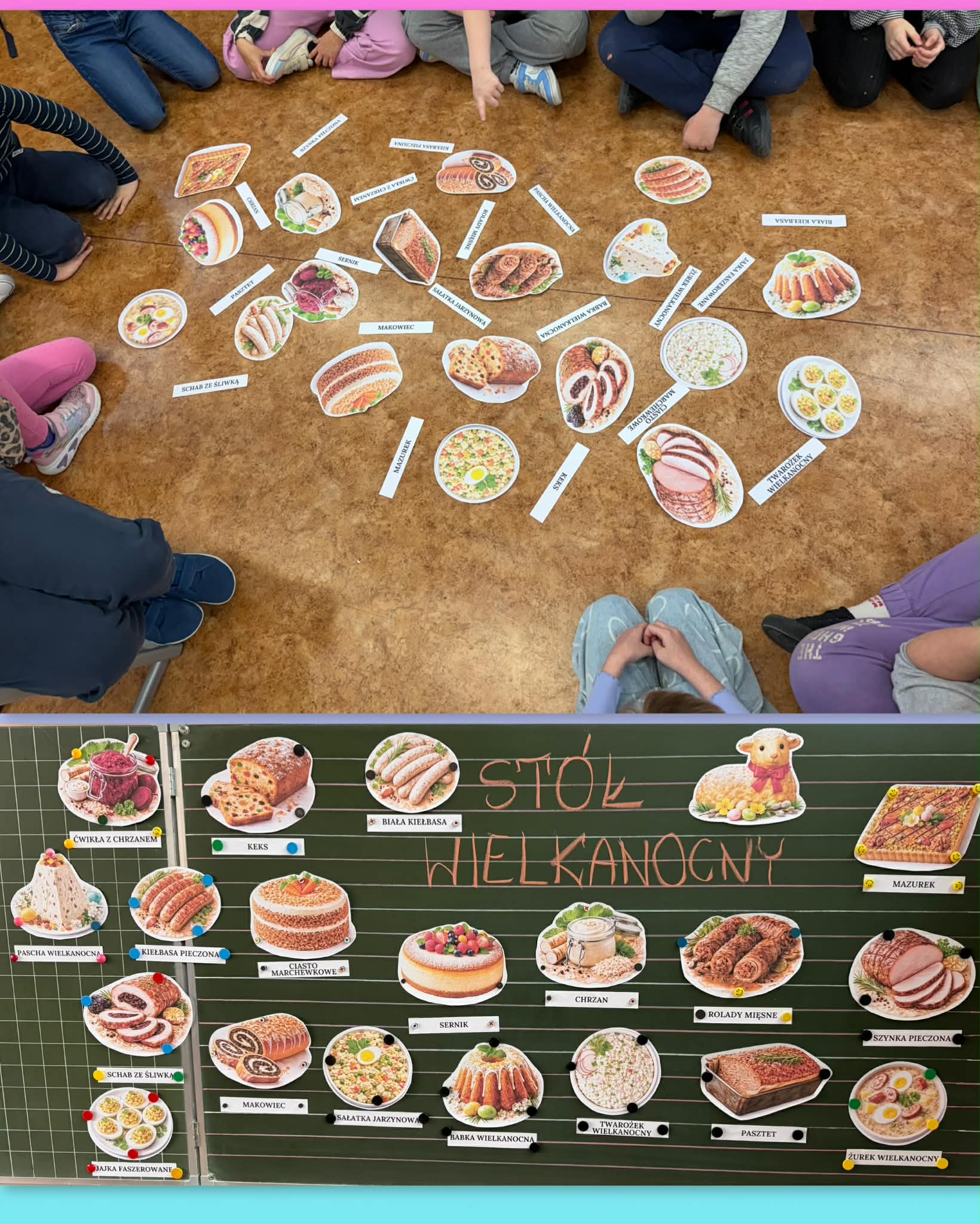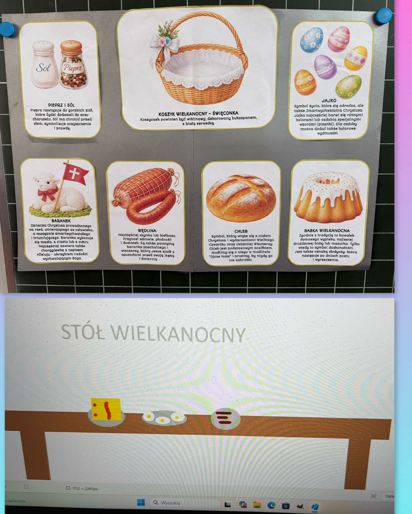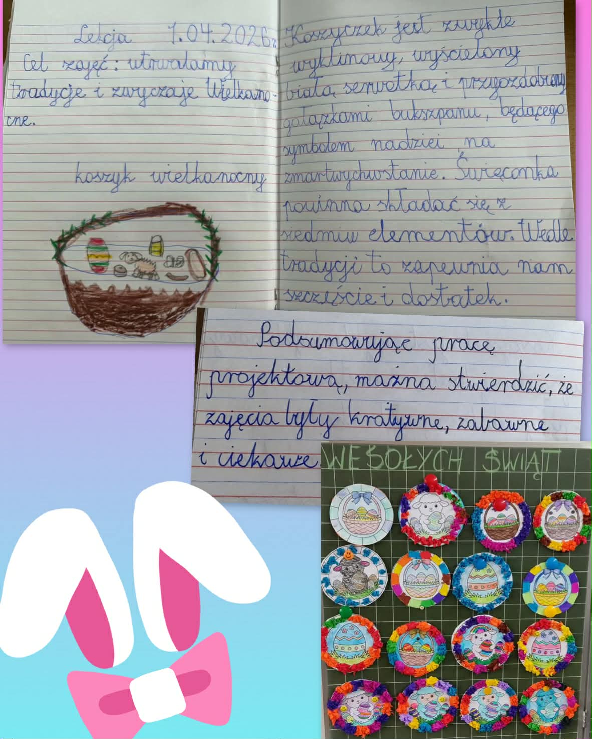Zajęcia rozpoczęły się od wysłuchania bajki pt. ,,Koszyczek Rozalii i Wiktora” oraz pogawędką na temat Wielkanocy. Uczniowie chętnie wypowiadali się na temat symboli świątecznych oraz zwyczajów kultywowanych w ich domach, takich jak przygotowywanie koszyczka wielkanocnego, malowanie pisanek, święcenie pokarmów, uroczyste śniadanie czy śmigus-dyngus. Rozmowa sprzyjała rozwijaniu umiejętności wypowiadania się i utrwalaniu wiedzy o tradycjach.
