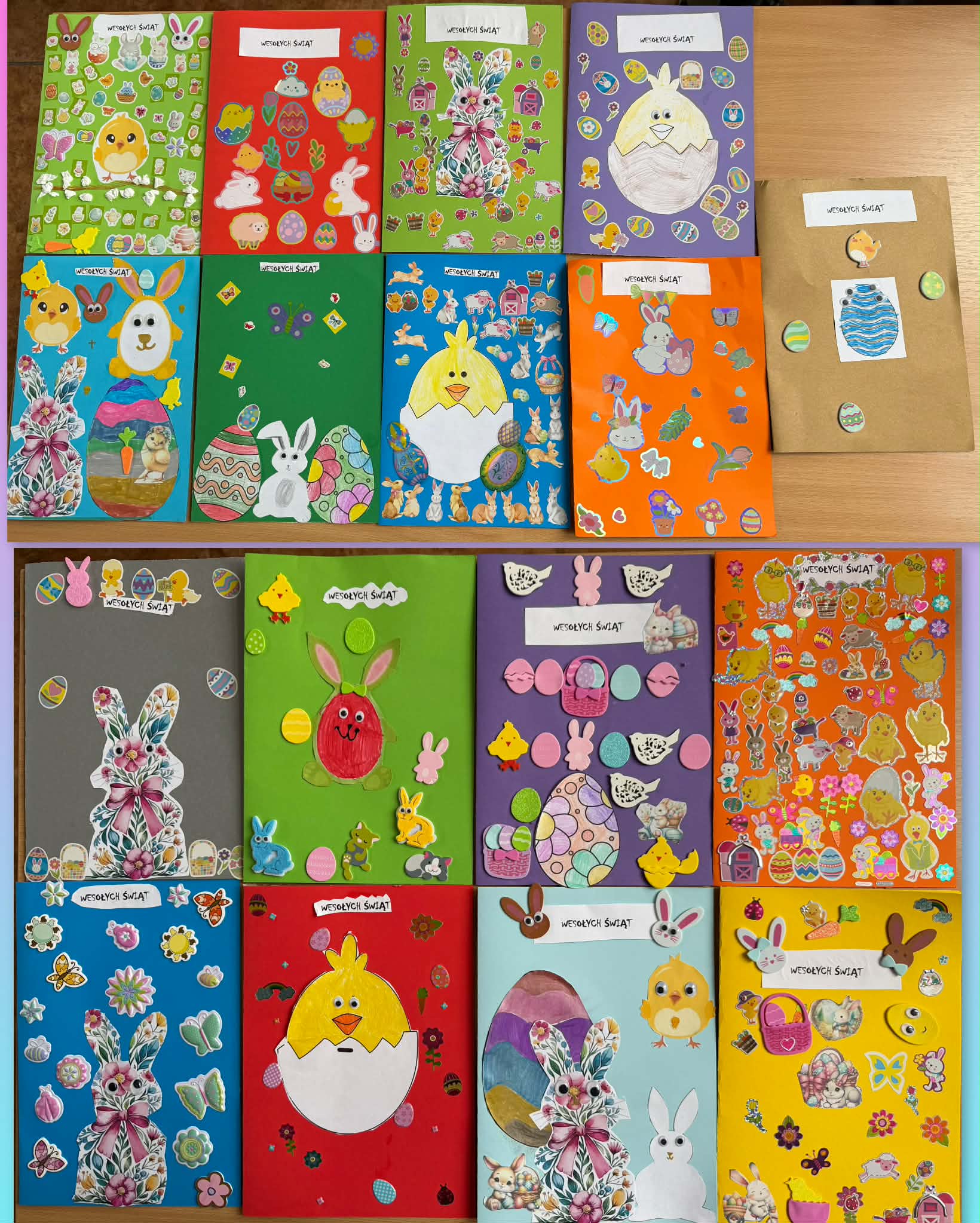 Kolejnym punktem zajęć było wykonanie kartek wielkanocnych. Uczniowie samodzielnie projektowali kartki, ozdabiając je świątecznymi motywami oraz wpisując serdeczne życzenia dla bliskich. Praca ta uczyła estetyki, staranności oraz wyrażania uczuć poprzez formę plastyczną i słowo.
