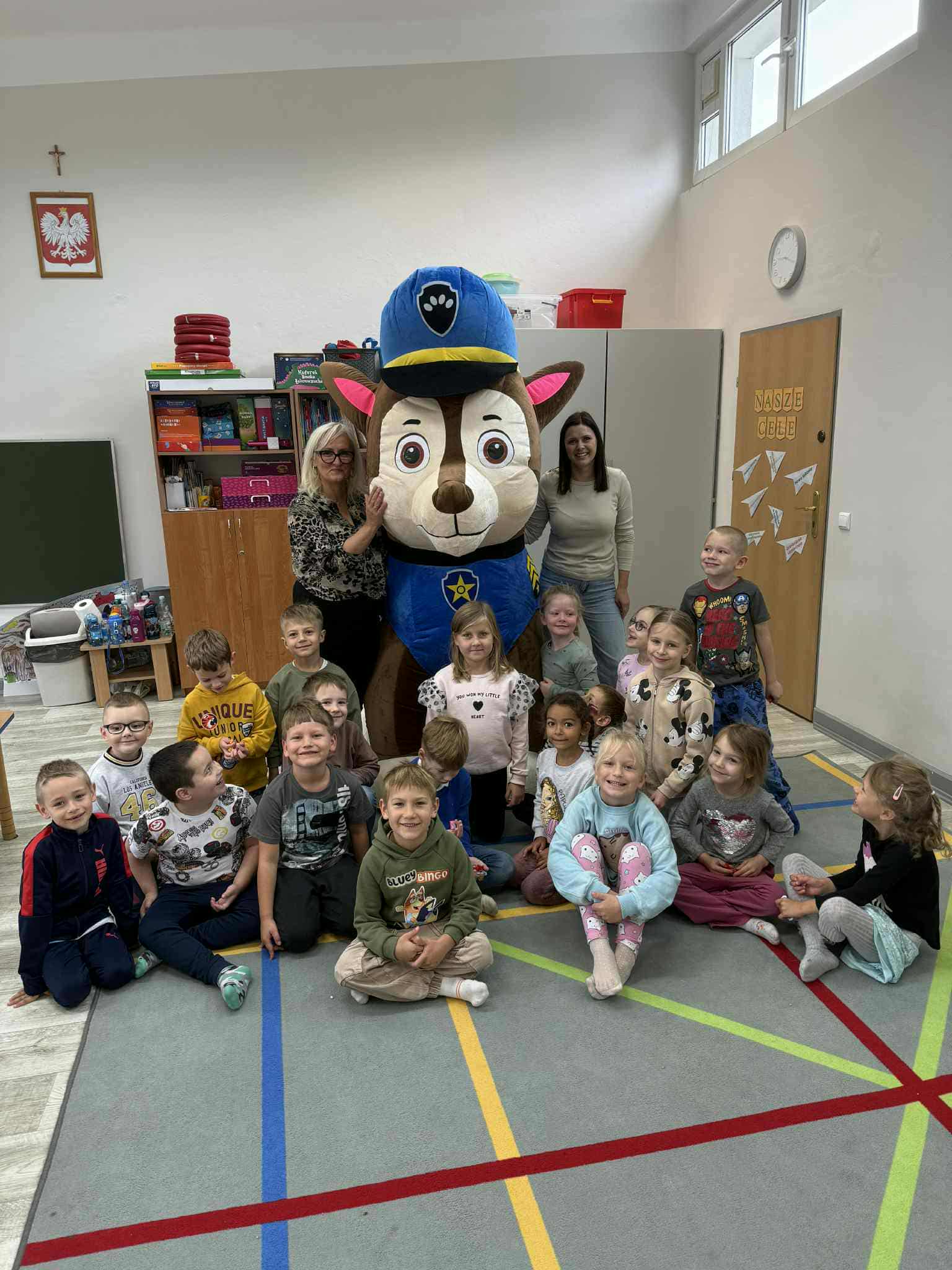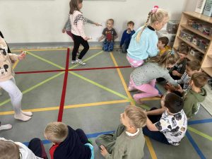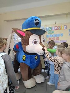 Ale to nie koniec atrakcji… naszą grupę odwiedził wyjątkowy gość – sam Chase z Psiego Patrolu! Dzieci były zachwycone i z radością przybiły piątkę swojemu ulubionemu bohaterowi!