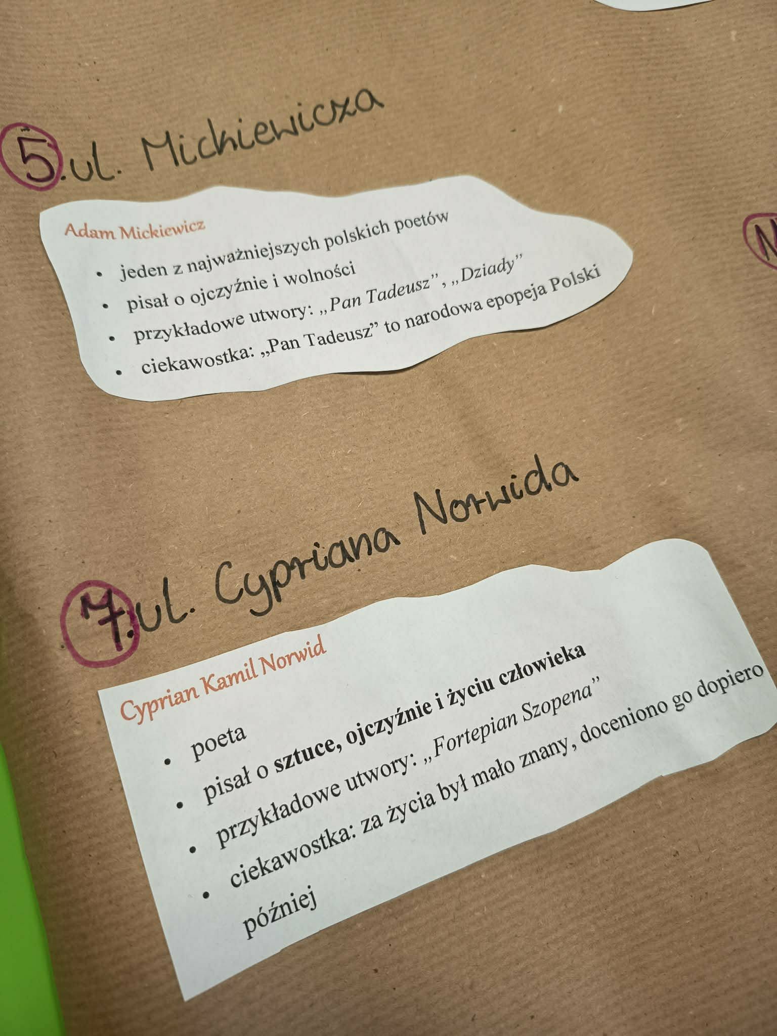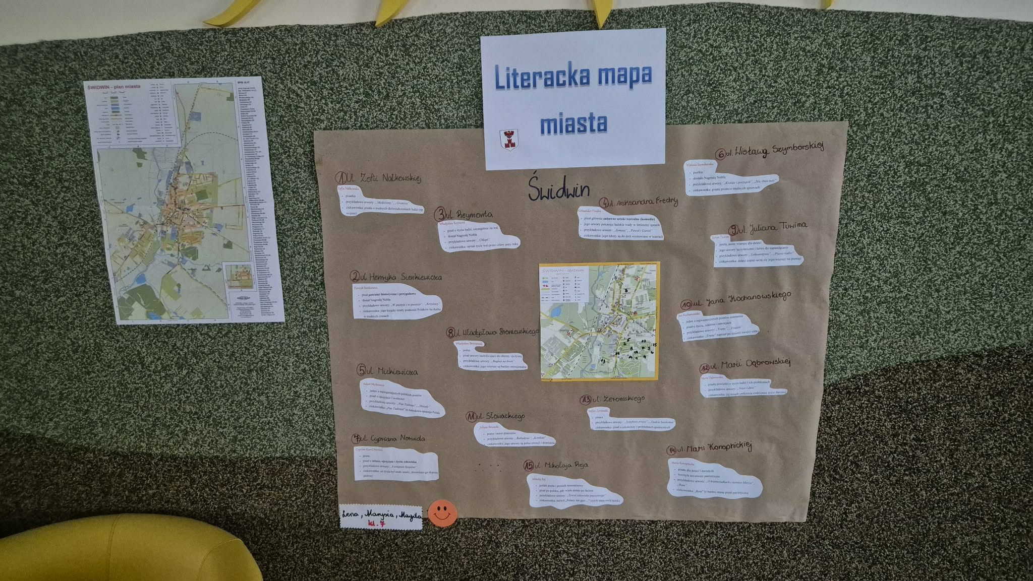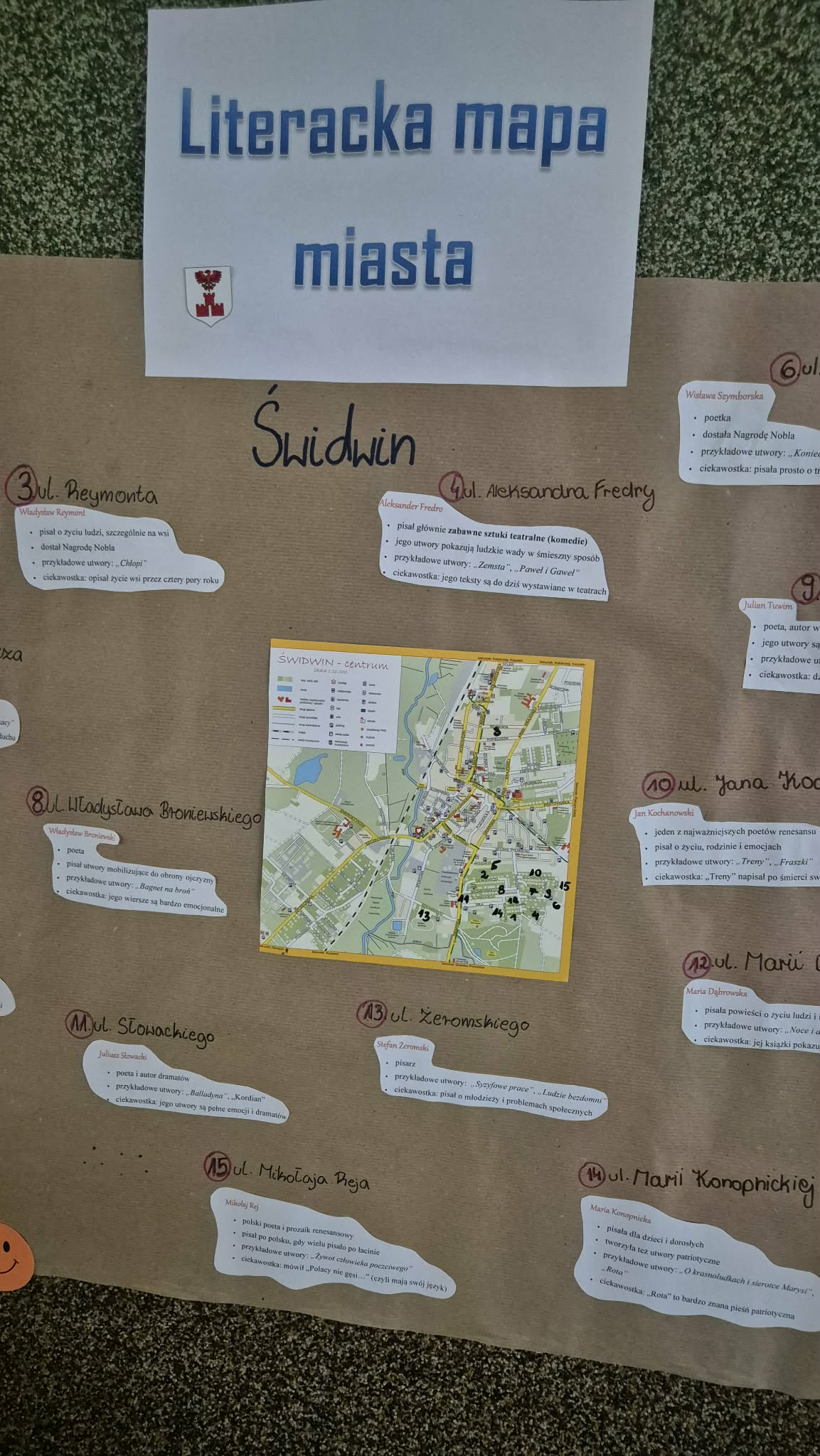 Ich zadaniem było poznanie sylwetek pisarzy i poetów, którzy są patronami ulic w Świdwinie. Uczniowie zgłębiali ich życie i twórczość, a następnie połączyli zdobytą wiedzę z przestrzenią miasta. Efektem ich pracy jest tematyczna mapa, łącząca plan Świdwina z informacjami o wybitnych twórcach.