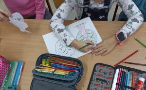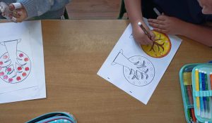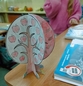 Następnie uczniowie podzielili się na grupy, aby stworzyć papierowe drzewka reprezentujące każdą porę roku.